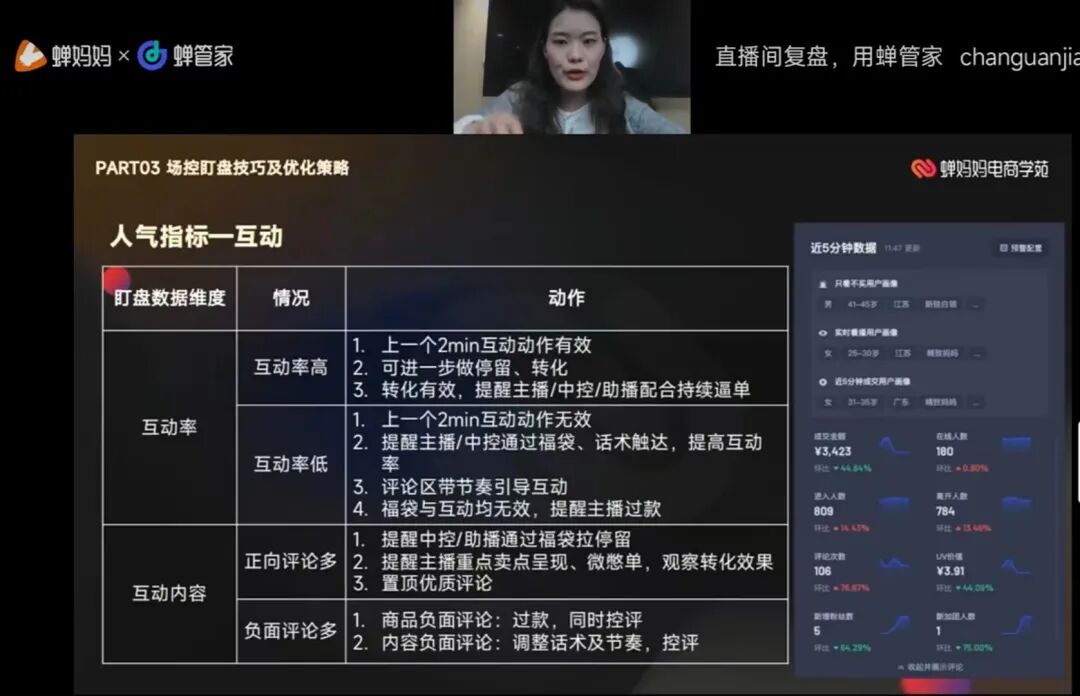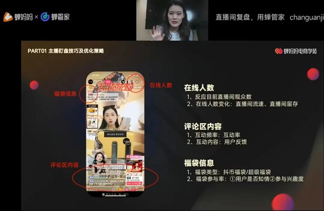 其一是单位时间用户的在线停留情况;其二是直播间评论区的互动情况、福袋与商品的交互情况;其三是单位时间内话术形成的成交效果。