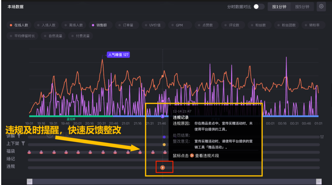 蝉管家新增违规视频与违规详情功能,能够在综合数据大屏上帮你及时找到直播中出现的违规内容,帮助直播间对违规情况做出快速反应,减少限流惩罚。