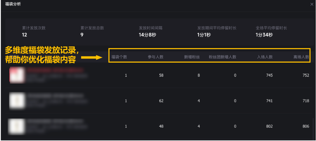 点击福袋分析,还可以看到该福袋发放期间对直播间的人气影响和互动效果,帮助运营分析福袋效果,优化福袋内容。