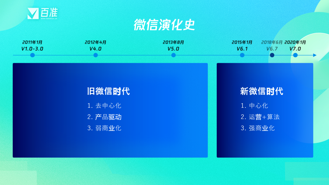 我们可以将微信划分为新旧两个时代,旧的微信时代以产品为王,去中心化非常突出,几乎没有运营,大家不聊商业,只聊用户体验和用户价值。