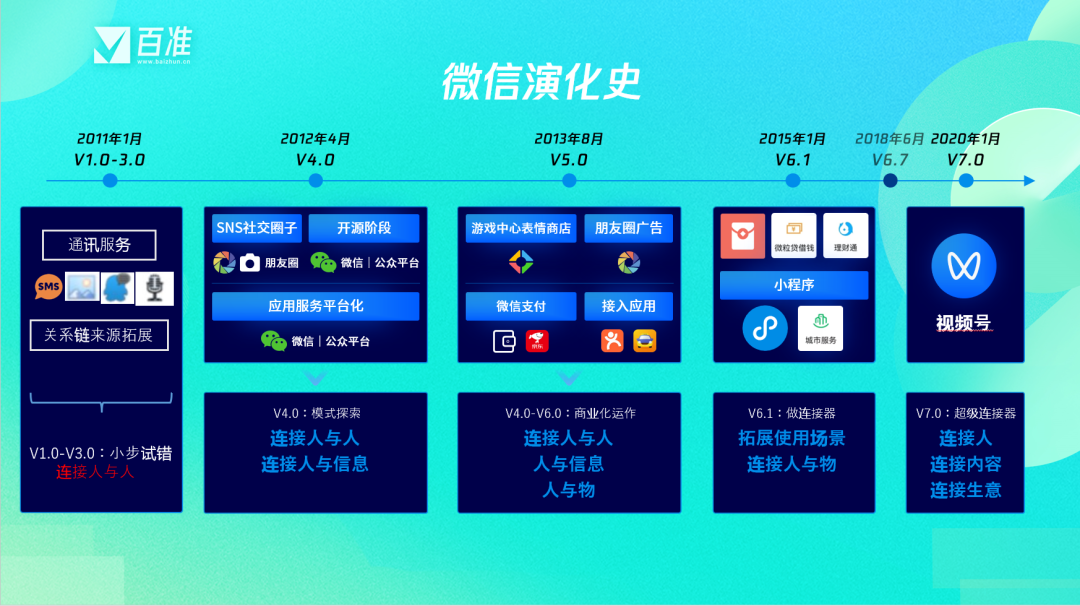 但新的微信时代,随着视频号到来,生态注重运营+算法,也更强调商业化。但这种变化,不会改变产品的主线的脉络,它依旧是从工具到社区到平台的一个状态。