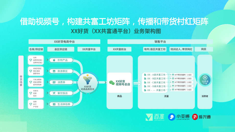 针对乡镇产地产品单一,无法支撑不同季节、长期在视频号直播带货内容的问题,陈一锴也提出了自己的解决方案,以浙江商务厅提出建设的乡镇、县域共富工坊为例进行了方案延伸: