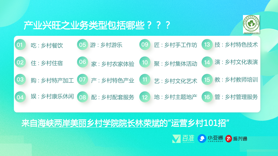 那么,乡村振兴有哪些具体产业抓手?海峡两岸美丽乡村学院院长林荣斌总结出了运营乡村的101招,内容丰富,且招招可落地。每条路径最终都可以给村里带来收益:卖货,吸引城市人群消费,公司旅游,商演教培等等。