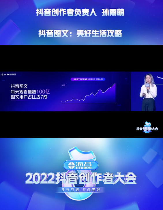 * 2022抖音创作者大会抖音创作者负责人孙雨萌指出:“图文每天的用户阅读量已经超过了100亿,图文用户占比达7成。图文作品已经成为用户获取有用信息的重要体裁。接下来,我们将重点激励真实有用、多元有趣的内容,并用推荐和搜索双列做好分发,让更多的创作者参与到抖音图文从1到100的过程中来。”
