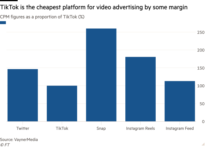 根据媒体研究机构VaynerMedia在2022年分享的数据显示,在TikTok上投放更高的成本几乎只要InstagramReels的一半,比Twitter便宜三分之一,也比Snapchat便宜62%。