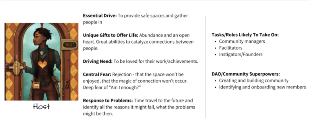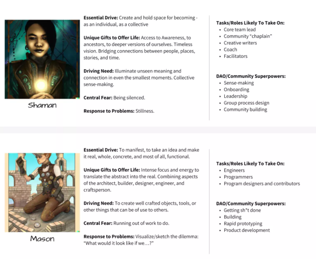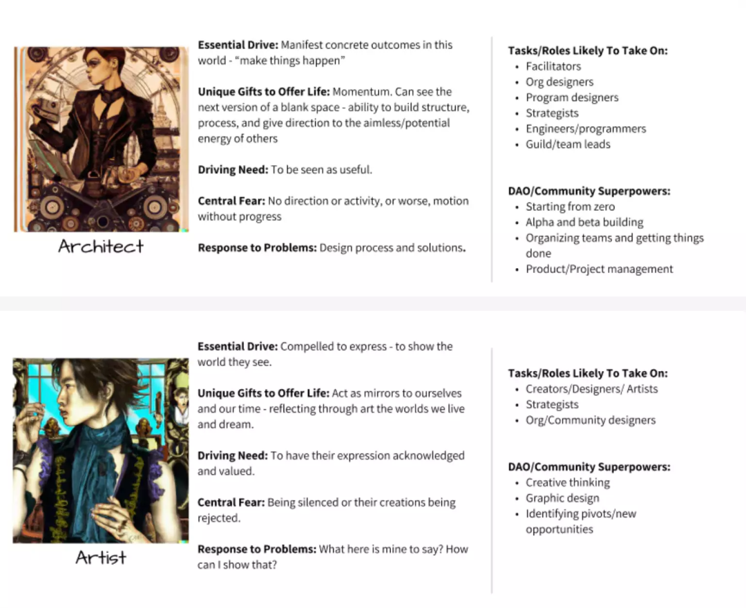 特定的原型似乎在web3社区和DAO核心团队中出现了演变的模式。揭示他们的存在可以帮助识别个人的优势和才能,进而可以在最合适的领域发挥一技之长,或者他们为什么可能会遇到与他们的角色的紧张关系。这个镜头可以提供一个框架来理解某人的动机、贡献和领导风格,以及在他们周围的团队和社区中发挥作用的动力。他们甚至可以协助我们设计团队和填补不同的角色。