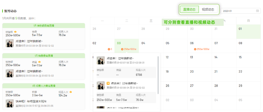 飞瓜近期在达人详情账号账号动态页面中,丰富了日历内容。现可直接在日历中查看达人直播/视频的关键数据。在“直播动态”tab中,可直观看到近一个月达人带货直播销售额区间、非带货直播观看人次关键数据。点选具体日期后可点击跳转至当日直播详情页。