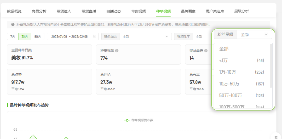 品牌的推广节奏会跟着新品上市、节日庆典、市场趋势等变化,为了更细度了解周期内品牌在达人推广上的营销成效,飞瓜近期在【品牌详情-种草视频】页面,新增“达人粉丝量级”筛选模块。用户可以通过筛选各量级达人,了解品牌的种草视频发布趋势,与达人带来的流量互动表现。