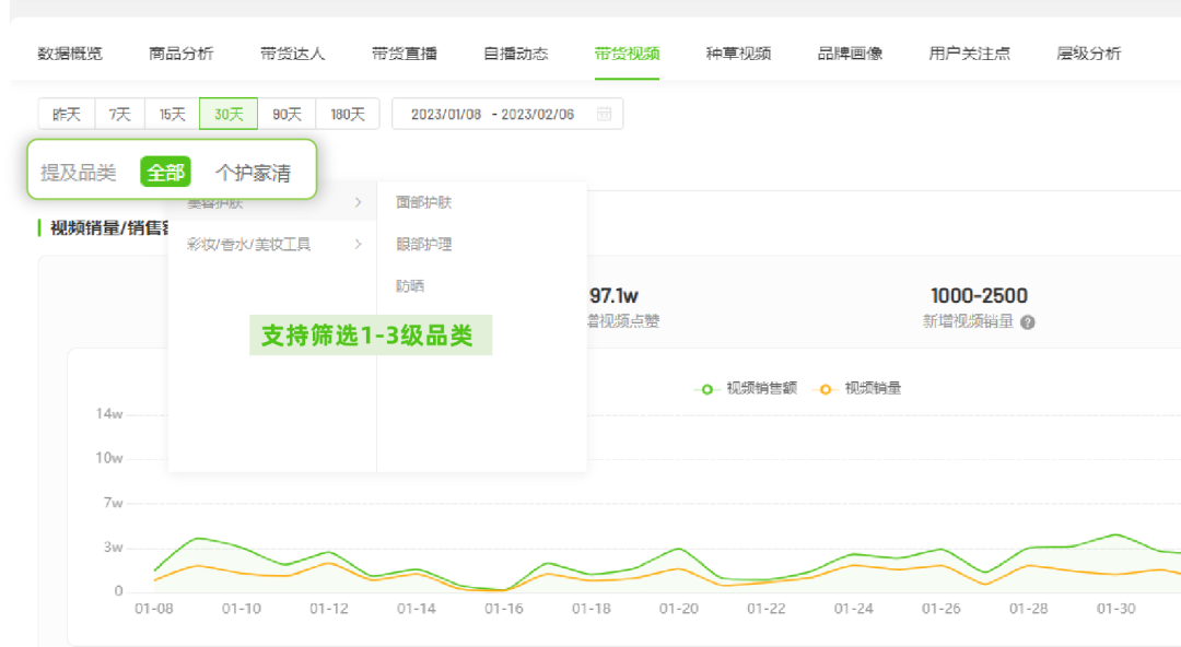 商品在抖音自然销量的变化趋势,可以反映出付费推广等营销方式是否带来打中目标客群心智,带来复购与品牌知名度。