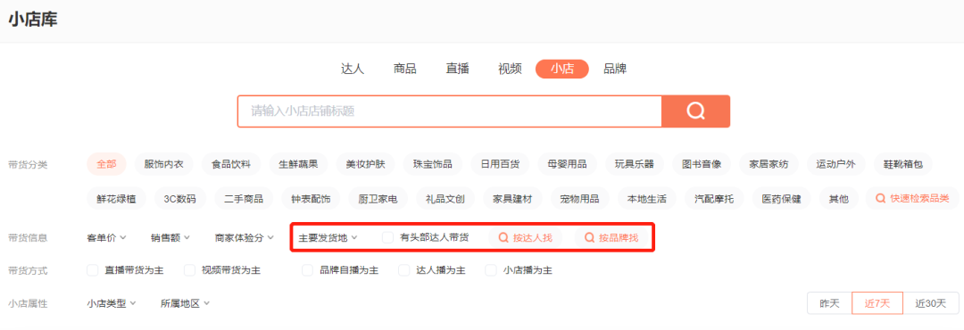 蝉妈妈本次小店功能更新,新增主要发货地、有头部达人带货、按品牌搜索、按达人搜索、带货方式 - 按比例筛选,还新增官方小店榜,通过多种方式筛选,快速查看小店整体表现,帮助品牌方了解竞对表现,对齐行业标杆;帮助达人筛选合作商家。