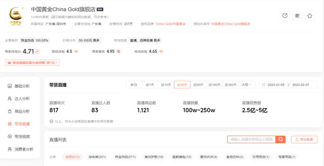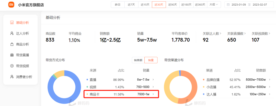 蝉妈妈本次小店功能更新,新增商品的“商品卡”成交贡献,例如查看中国黄金China Gold旗舰店的某件产品发现,近30天其来自商品卡的销量为750-100。可以看出该产品主要靠直播带货,其次是商品卡,对于该店就竞对来说,有利于快速展握其商品营销的主要方向,辅助制定营销策略。