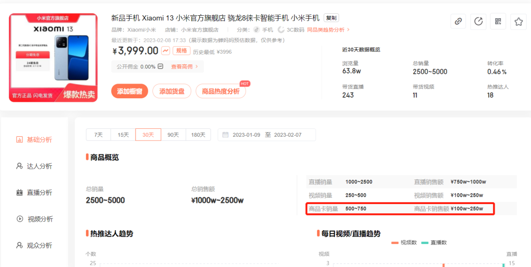 新增商品卡成交Top3的商品,例如查看小米官方旗舰店近30天的带货销量贡献,11.58%的销量来自于商品卡,点击查看商品卡成交Top3的商品,第一名小米手机13,商品卡销量占比约1/3,说明有1/3的用户是通过“人找货”的方式购买该产品,推测用户对该产品的兴趣度高。