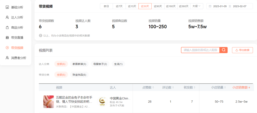 包含带货视频数、视频达人数、视频商品数、销量、销售额等维度的短视频带货概况数据,提供周期内的店铺商品关联的所有挂车短视频,有利于分析店铺的短视频内容策略及短视频达人策略。
