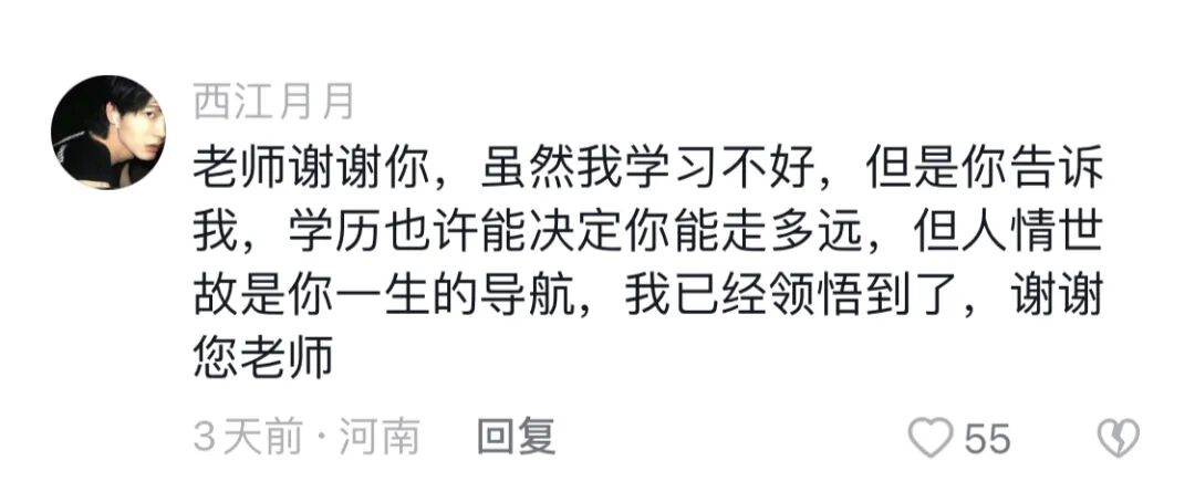 “老师谢谢您,虽然我学习不好,但您告诉我,学历也许能决定你走多远,但人情世故是一生的导航。现在我领悟了,谢谢您。”