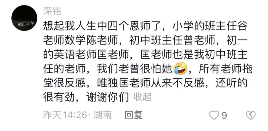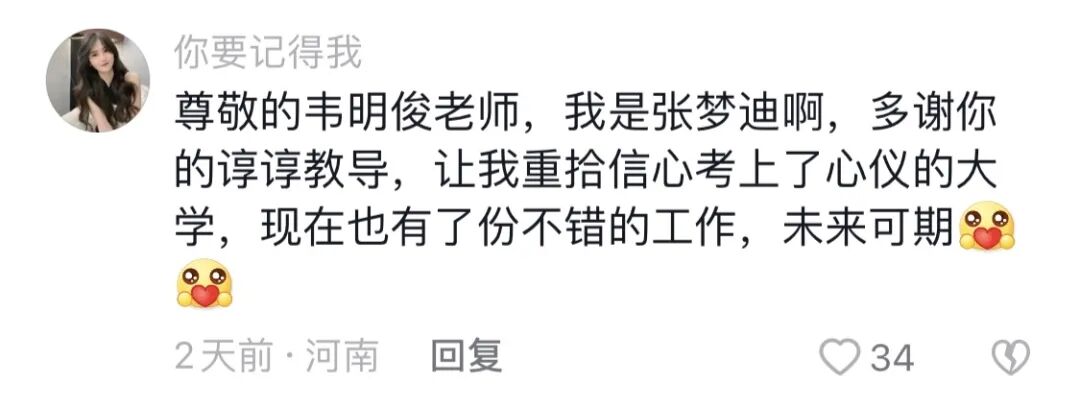 那些曾经受过韦老师教导的学生纷纷来到了抖音评论区报道。他们报出自己的名字,就像是中学时候一样。