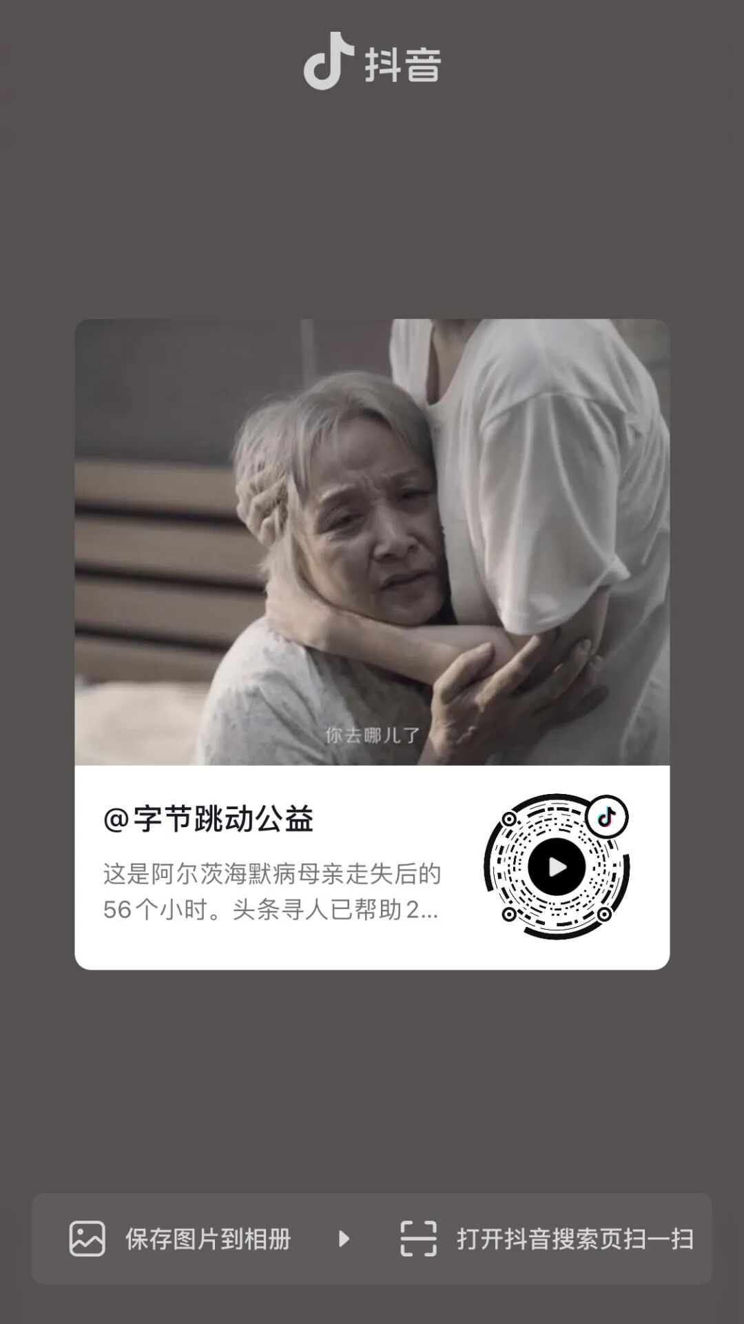 打开抖音,搜索“阿尔茨海默病母亲走失后的56个小时”,或用抖音扫描下图中的二维码,即可观看完整版。