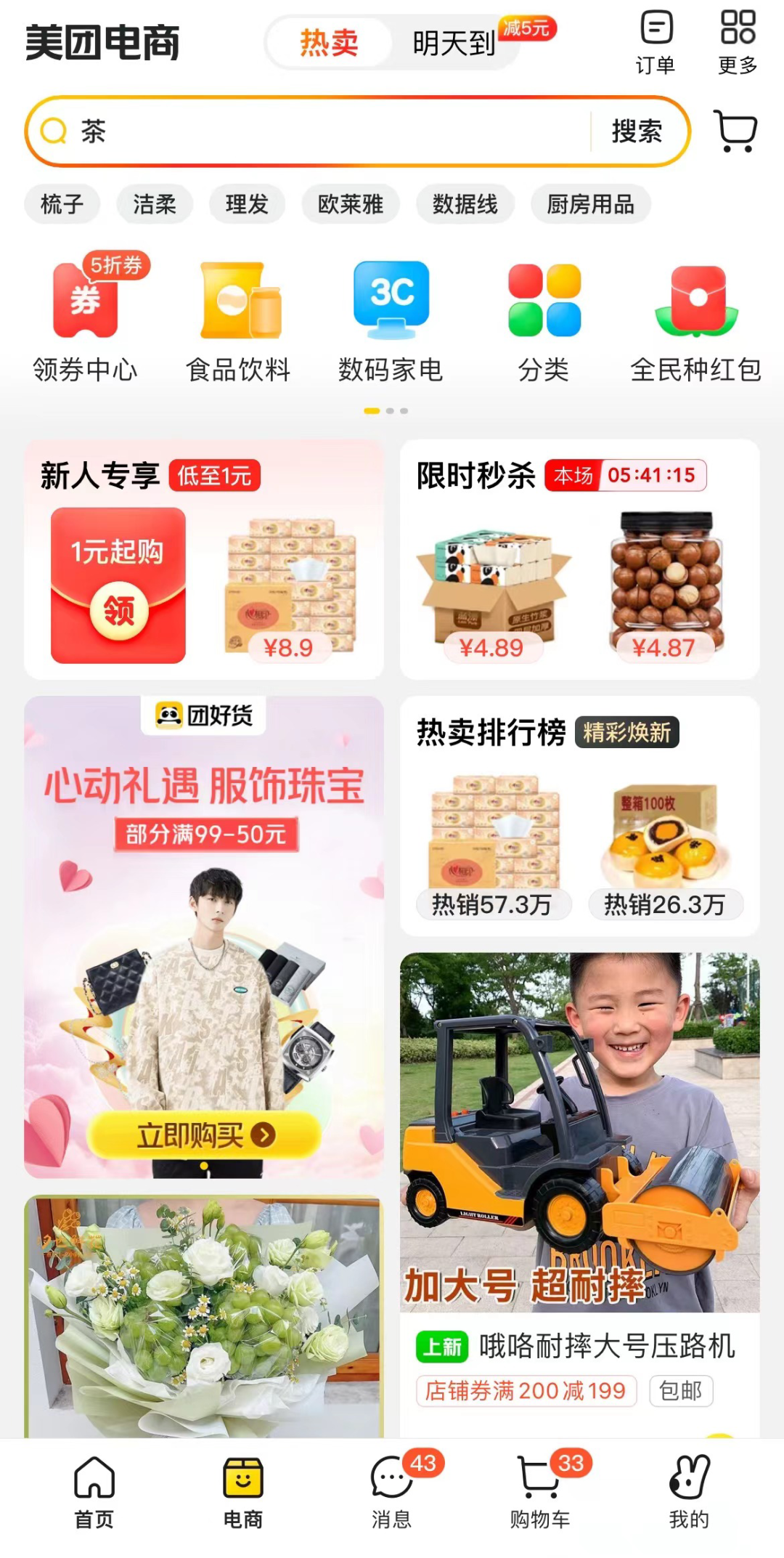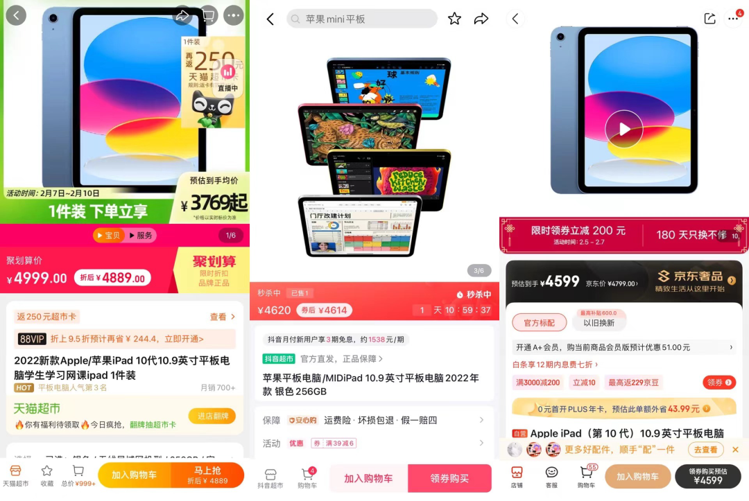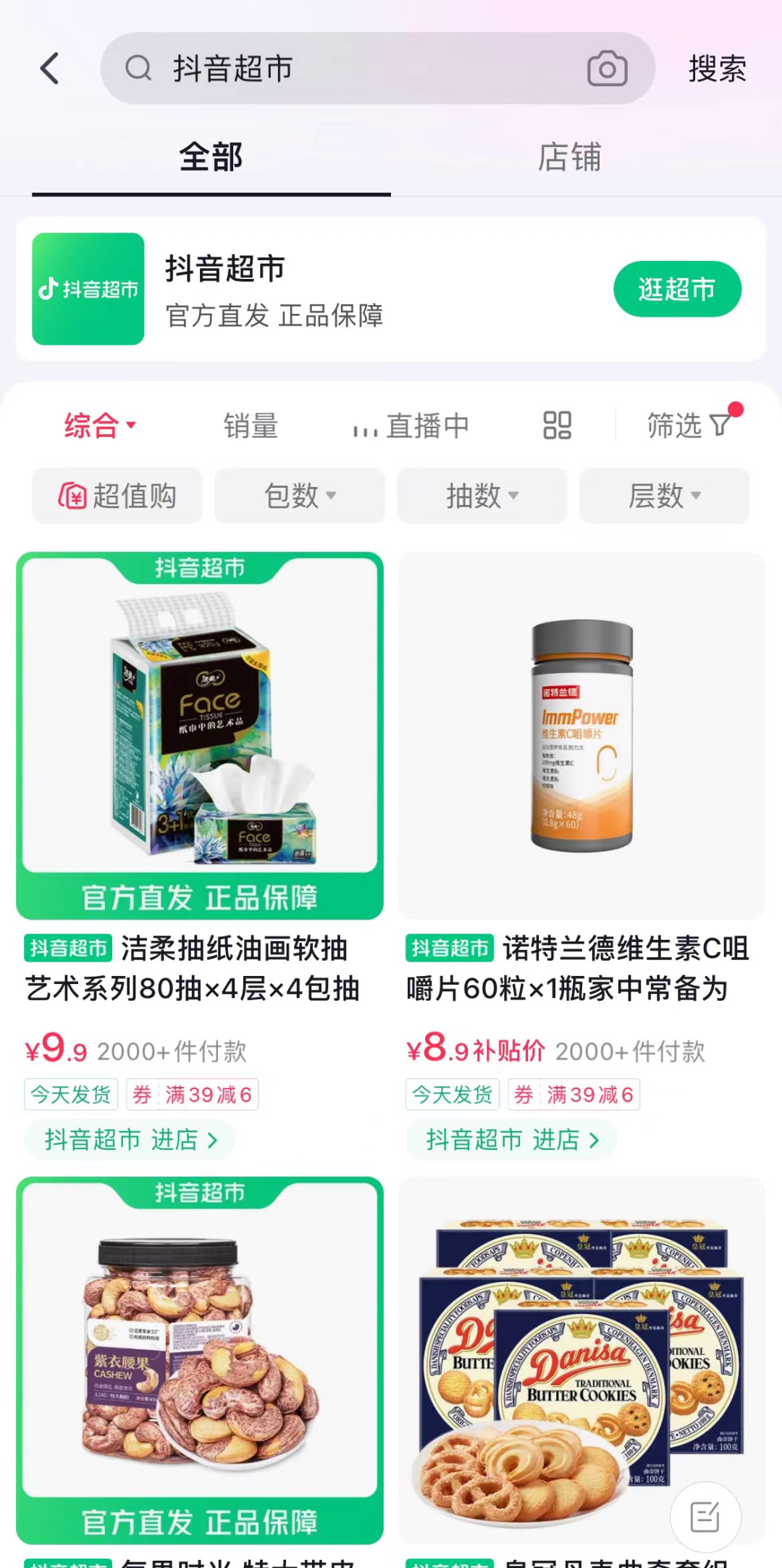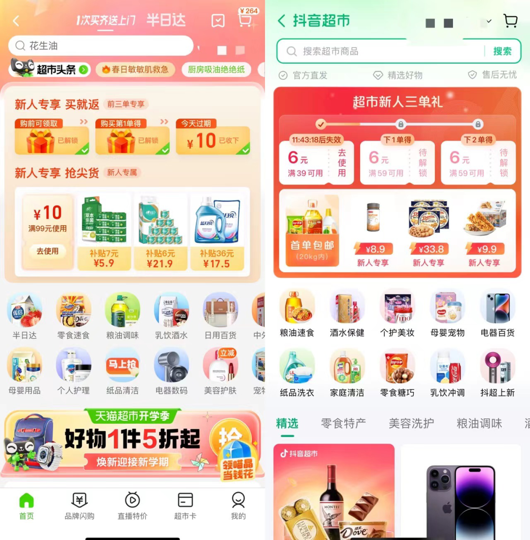 自从布局本地生活业务以来,从到店业务再到试水外卖,抖音迈着大步,深入美团腹地。日前,抖音将在北京、上海、成都试点外卖业务的消息登上微博热搜榜,这一消息直接造成了美团的股价波动,甚至一度跌破150港元,跌幅超过8%。今年春节,抖音自营的货架式电商“抖音超市”在春节期间正式上线,并顺势推出“春节不打烊”活动,电商超市也迎来了新的变局。天猫超市、京东超市作为老牌玩家,供应链、物流、仓储都已成熟,而美团也在近两年发力,先是在2020年开始搭建美团闪电仓,2022年10月,美团优选升级为“明日达超市”,可见美团做超市的决心。作为美团目前最有力的对手,抖音也在今年开年入局超市业务,有着直播电商的基础,在供应链上抖音显然有优势,但是仓储和物流体系的搭建需要花费大量的时间、财力,抖音能后来居上吗?根据浙商证券的研报数据显示,即时零售低渗透、高成长,可渗透空间约4万亿。在这片前景广茂的蓝海,仍待更多入局者进一步开发。作为新业务,抖音超市在首页并没有明显的入口,即便是在首页的购物页面,也没有超市的导流提示,用户需要在搜索栏检索“抖音超市”,才能找到入口。进入页面后,娱乐独角兽注意到,抖音超市跟天猫超市有着极高的相似度,搜索栏都位于页面最上方,其次是新人专区,同样的“新人三单礼”和“新人专享尖货”,接下来同样是品类栏,不一样的是,有着仓储物流优势的天猫超市,将“半日达”放在了头号位。而抖音在物流上明显稍逊一筹,有网友晒单其在抖音上购买的商品物流,从下单到收货,共用了四天的时间,下单次日由中通快递揽收,从广东发往北京。若定位在广东省,在搜索框下方则会出现“次日送达上门”“满88元包邮”等提示。若用户定位在广东省内,可拥有次日达、满88包邮等服务,若定位于深圳,还包含更为精准的小时达服务。从品类看,抖音超市目前有10个品类,粮油速食、酒水保健、个护美妆、母婴宠物、电器百货、纸品洗衣、家庭清洁、零食糖巧、乳饮冲调和抖超上新,而天猫超市和京东超市的品类数都是20个。从商品丰富度看,以粮油品类的食用油为例,抖音超市食用油的sku共21个,有金龙鱼、狮球唛、福临门、润年、润心、长寿花、欧丽薇兰等7个品牌。天猫超市和京东超市在多年的积累下,不论是sku数量和品牌数都已跟抖音超市拉开差距。价格上,以2022款256g的iPad 为例,抖音超市券后价为4614元,天猫超市券后价为4889元,并返250元天猫超市卡,实际价格也就是4639元,京东超市并无苹果品类,不过在苹果的京东自营店,该款产品券后4599元。整体来看,将数码电器品类作为主打的京东更具竞价优势,天猫超市和抖音超市价格相差不多,不过天猫超市以超市卡的名义刺激了用户二次消费。2022年下半年以来,电商超市风起云涌,天猫、京东、美团在超市业务上都有了不同程度的升级和布局。去年开始,天猫超市逐步打开,逐渐从供货供销的模式转变为直接面向品牌,将私域流量、用户、供应链能力全面开放给品牌商家。2022年9月,天猫超市首次举办了双十一商家大会,天猫超市总经理刘一曼宣布,天猫超市服务商家策略的两个核心关键词为“开放”和“增长。也就是说,自营的模式正在逐渐打破,跟品牌合作成为天猫超市接下来的重点,这一变化直接体现在天猫超市的页面中。在天猫超市的低栏中第二栏是“品牌闪购”,直接导入“品牌馆”,星巴克、百岁山、百事、强生等一众大牌均在首页有推荐位。数据显示,经过近一年的试点,目前天猫超市私域引导成交占比已经超过50%。与此同时,迈入第11年的天猫超市,供应链、物流、仓储体系已经覆盖到了全国大多数城市。据刘一曼介绍,天猫超市已经建成辐射全国的5大集货转运仓、6大区域中心仓和28大城市仓,以及8大冷链中心的确定性物流供应链网络,实现了300个城市、1200个县域确定性的准时达,送货上门、半次日达率均超过60%。同样是在去年9月,京东超市也公布全渠道业务最新进展。住得注意的是,品牌也成为了京东超市的重点。京东超市发布的“全渠道案例全景图2.0版”,展示了蒙牛、农夫山泉、联合利华、雀巢等品牌在链网融合下的的增长数据。数据显示,京东超市联合京东小时购已覆盖超8.7万家商超类实体门店,超2.9万个商超快消品牌,可为全国400多个城市的消费者提供即时消费服务。不难看出,仓储是京东最大的优势,将服务的时效从以“天”为单位,提升到了以“小时”为单位。这种线上的电商超市与线下仓储结合,以提升配送时效的打法,也同样是美团的重点。从2020年开始,美团就开始了闪电仓的布局,不同于天猫和京东跟大品牌合作,美团主要通过招募商家线下建设前置仓,合作商家主要负责门店选址、租仓、商品采购、仓店日常运营、人员招聘管理等内容,而美团则提供各种运营上的指导。这种小而密的仓储模式,对于场地的限制较小,渗透率更高,配送时效也更短。以便利店前置仓为例,面积一般120至300平米,3000至5000个SKU,经营品类主要涉及酒水饮料、休闲零食、日用百货、美妆洗护、服饰鞋帽、手机数码等日常生活便利类商品,经营范围覆盖周边半径3到5公里。截至2022年6月,美团闪电仓项目已经在全国覆盖了100多个城市,合作商家超过500个,商家建店1000余家。四个月后,美团的超市电商再次升级,美团优选更名为“明日达超市”,从名字来