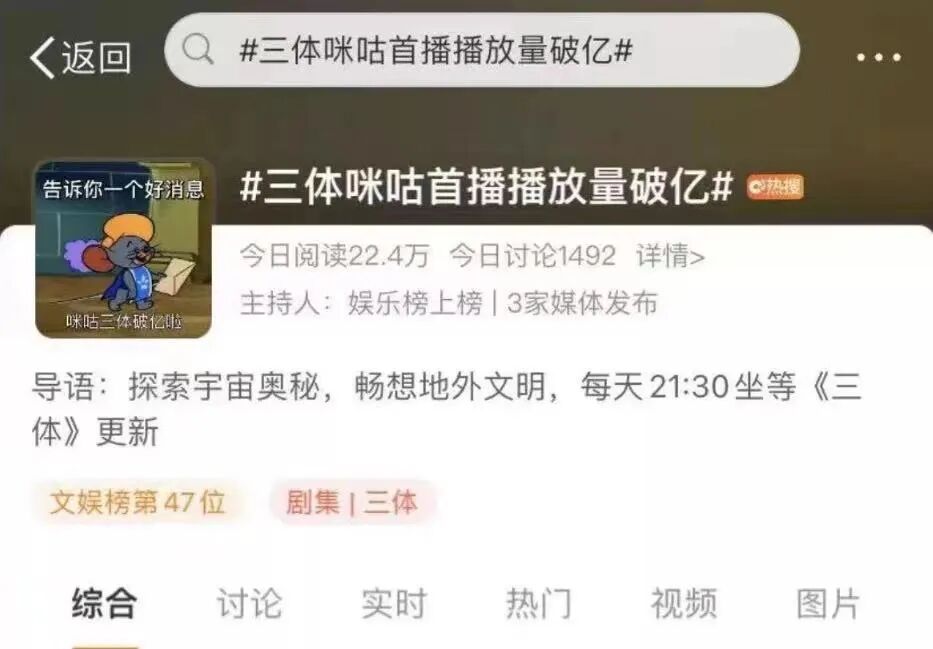 在《三体》开年口碑热度双爆背后,其联合出品方中国移动咪咕也引起了外界的注意,其在《三体》排播、技术、商业、宣传等多个维度整合资源共同创新助推,最终使这场科幻浪潮席卷全网。