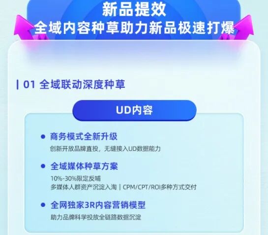 首先,在机会人群的精准触达上,阿里妈妈达摩盘推出专属人群包,覆盖38礼遇人群、38期间高活跃人群及大促精选人群,助力品牌高效锁定高潜人群;UD品牌升级全域数字营销服务能力,深度整合全域顶级媒体资源,助力品牌一站式全域数字营销。此次38节,UD品牌手淘topshow首次商业化,沉浸式聚焦消费者购物场景,加速品牌占领心智;算法加持“超级全域通” ,实现开屏、信息流、贴片等不同广告形式一站式联投;UD品牌TOP新增百度品专资源,实现全场景媒介投资。在结案能力升级方面,UD品牌支持MTA多渠道归因和内容兴趣衡量指标,科学量化渠道价值。UD效果打通全域拉新人群通路,白盒人群赋能,支持自定义人群沉淀站内。![]()