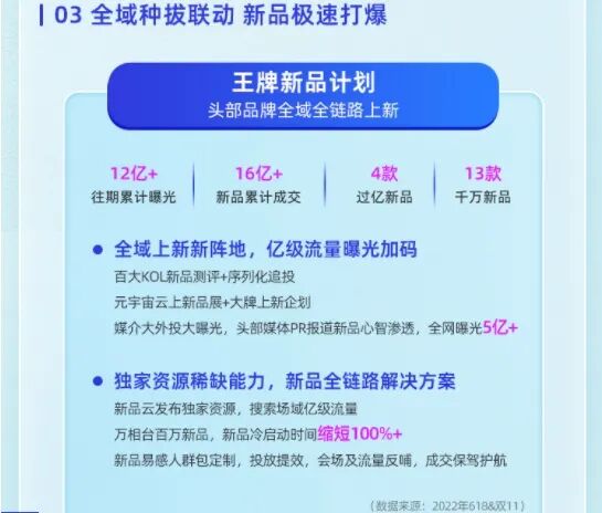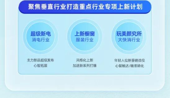 今年2月UD效果完成微博媒体接入,包括图片和视频多点位资源。微博凭借高达60%高转化人群浓度成为品牌上新投放媒体矩阵的第一梯队。线下多场景覆盖赋能线上。阿里妈妈整合内外多元资源,覆盖居家、到店、休闲、校园四大场景,为商家打通增量新路径。联动电视淘宝快速扩量兴趣人群,高比例拉新;通过天攻智投整合线下多触点提升商家全域TA渗透率,实现品牌-电商双向联动;高德地图以优惠政策加码精准渗透明确到店意向购物人群;借助天猫校园优势,触达淘系3300w+学生人群规模,打造亿级曝光,独家开放手淘学生人群使用权。