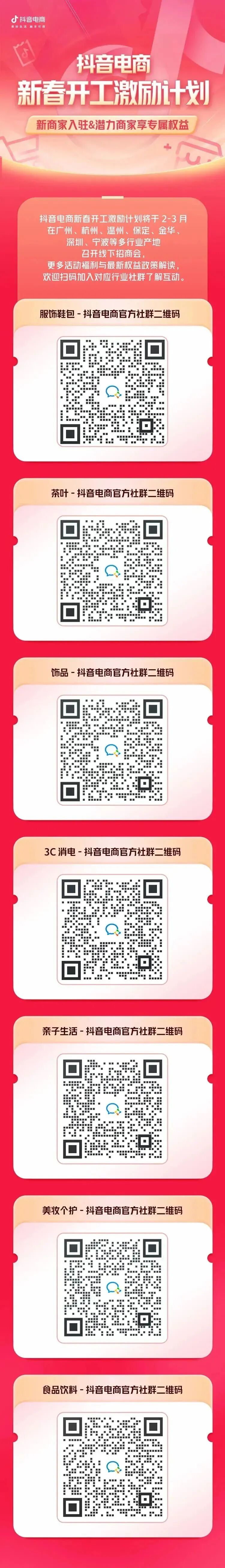 另外,抖音电商新春开工激励计划将持续在2-3月于广州、杭州、温州、保定、金华、深圳、泉州、宁波等全国多行业产地进行线下招商会的召开。更多活动相关福利与最新权益政策解读,欢迎扫码加入对应行业群了解互动。