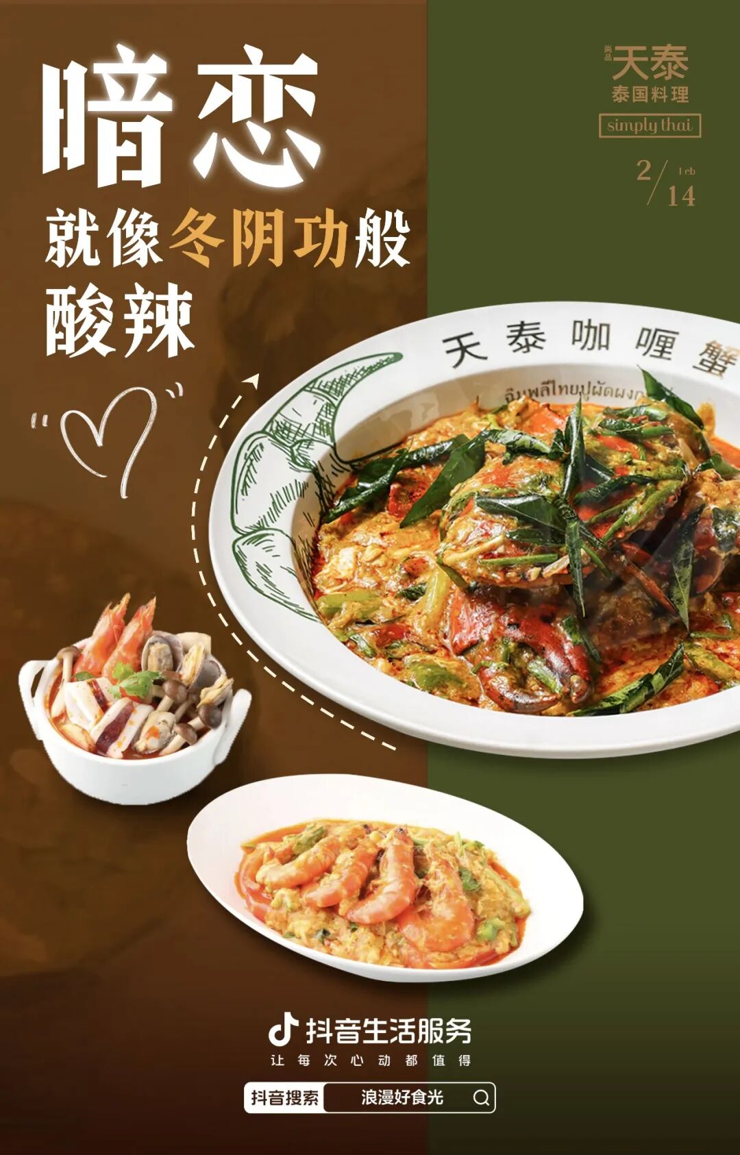 漫长的日日夜夜,暗恋的情愫如惊涛骇浪隐然于胸。情人节到了,不经意间地向TA发出邀请,来天泰吃一顿浪漫的双人餐吧!看看TA是否也热爱酸辣的冬阴功汤和浓郁的咖喱蟹,彼此试探胃口,也是确认默契,或许你由此品味到双向奔赴的恋爱滋味。