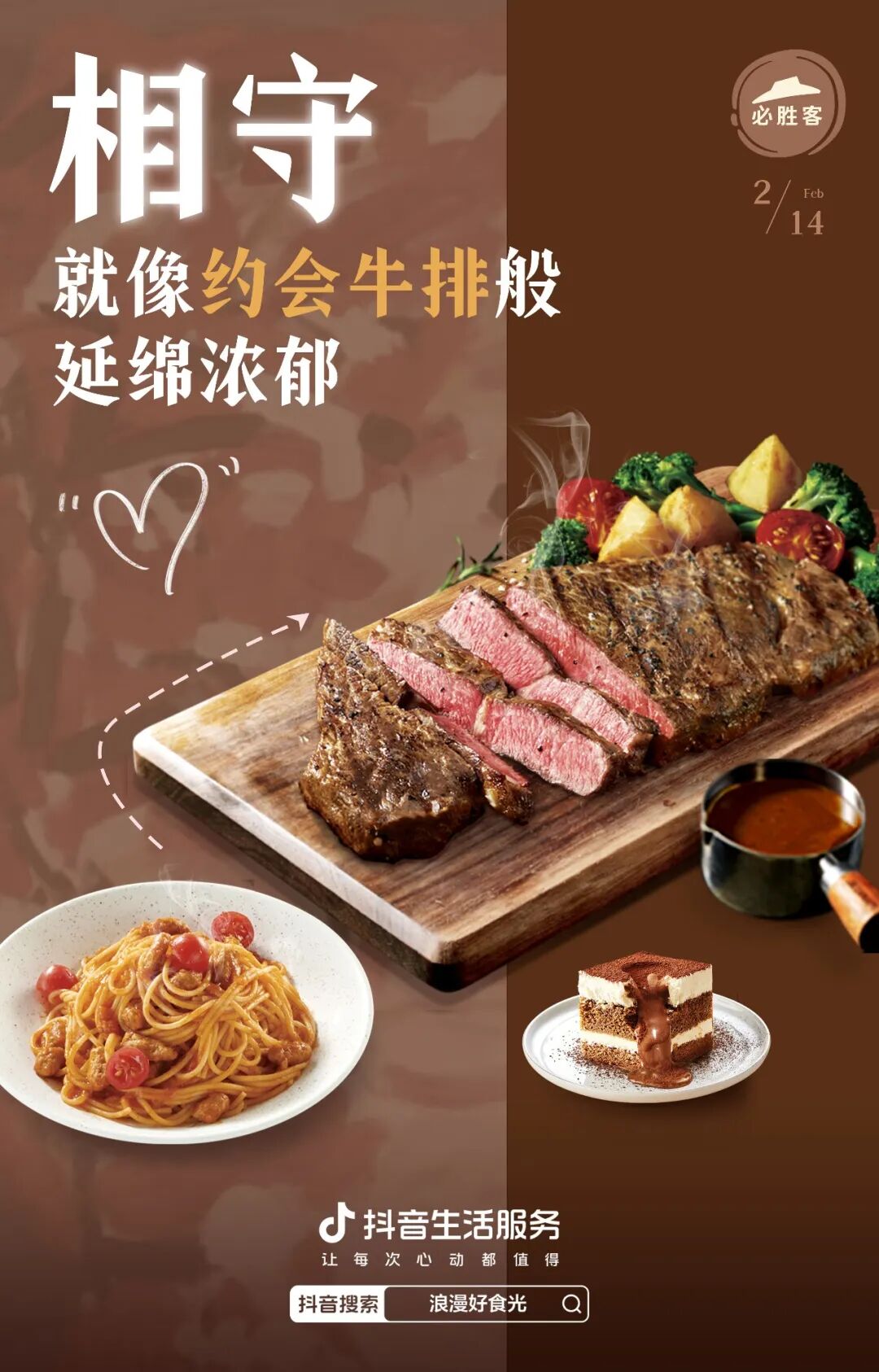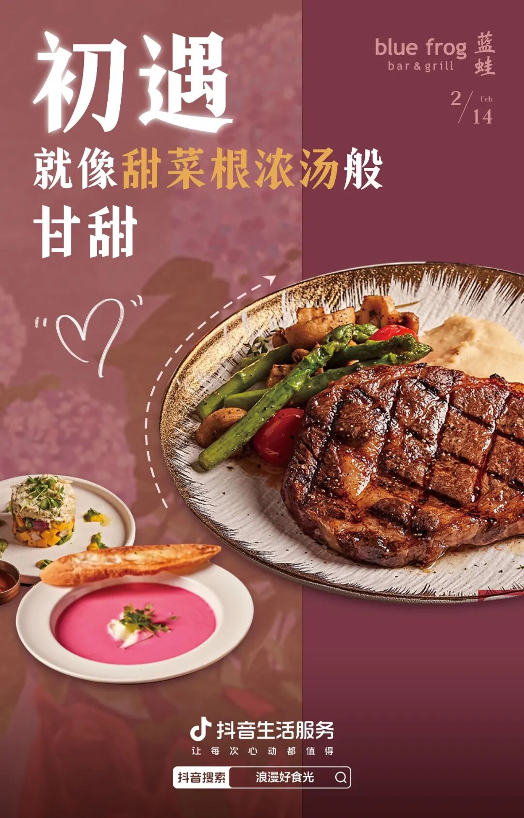 我们普通人该如何诠释爱?美食,是生活中最治愈的良药,抖音生活服务在情人节联动众多餐饮品牌,限时推出多类型情人节套餐的“主打菜”。