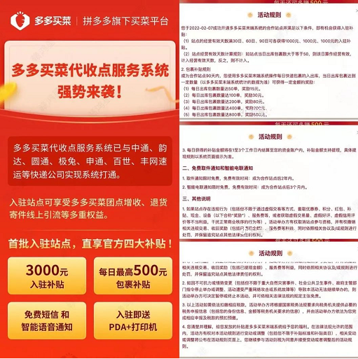 2022年,业内传出有关多多买菜布局快递末端市场的消息。不过,多多买菜代收点并不具备经营快递业务的相关资质,社区团购+快递代收的模式很快宣告破灭。