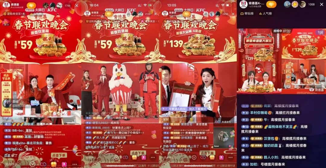 首先是大场直播场次的时间选择,正中下怀,肯德基在除夕1月21日和初五迎财神1月26日这两天,打造了肯德基新春直播大场,本身就是在祝福,再将肯德基的祝福和诚意带到大家面前。