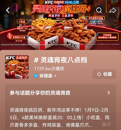 从去年9月以来,肯德基灵魂宵夜已经在抖音消费者心目中建立起了一定心智。今年春节期间,肯德基灵魂宵夜持续营业,继续用灵魂宵夜丰富且有诚意的货品组合回馈消费者,精心推出“灵魂宵夜八点档”。除了鸡爪香骨多多盒、鸡架盒,基于对于此前消费者需求的洞察,肯德基更是贴心地为“鸡爪星人”推出了专属只有鸡爪的爪爪盒,满足大家深夜吃肉嗦骨,过足嘴瘾。