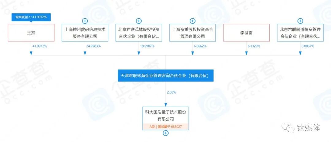 除了大客户的身份外,神州数码还是国盾量子持股机构天津君联林海企业管理咨询合伙企业(有限合伙)(简称:君联林海)的出资方。企查查显示,神州数码持有君联林海25%的股权份额。而君联林海对外投资企业只有一家,即国盾量子。