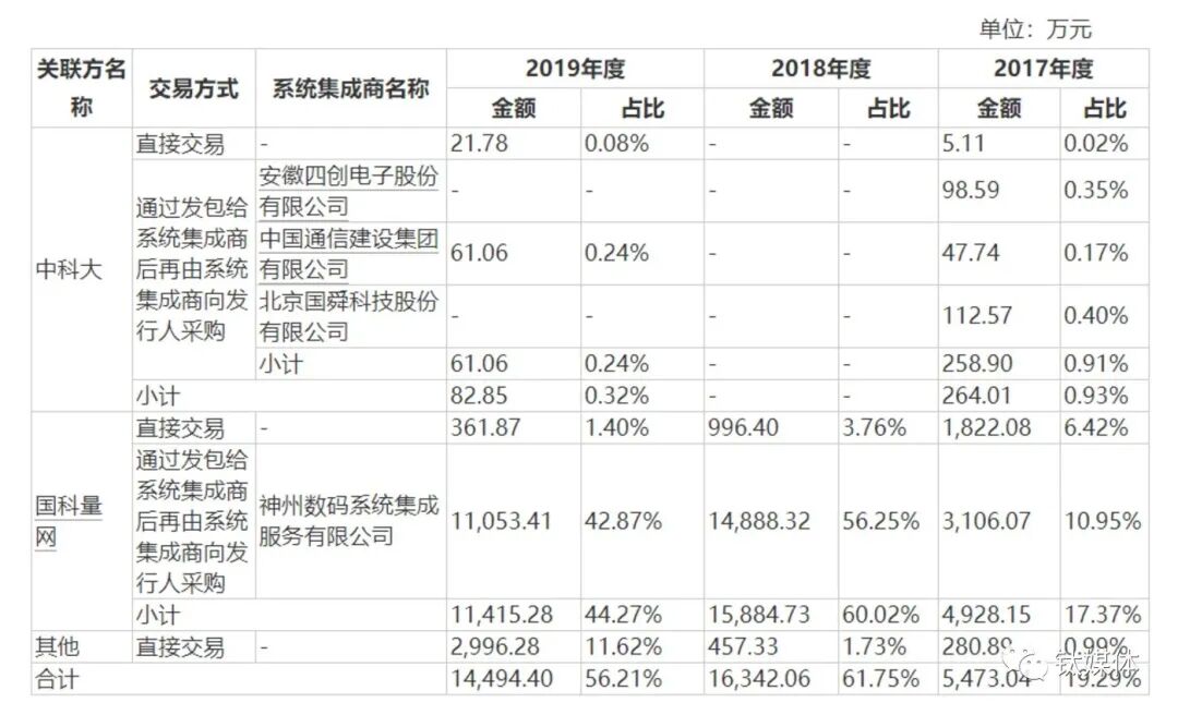 通过系统集成商神州数码,国盾量子在2017年到2019年与国科量网发生的间接交易金额分别是3106.07万、1.49亿、1.1亿,占当期营收的比例分别是10.95%、56.25%、42.87%。