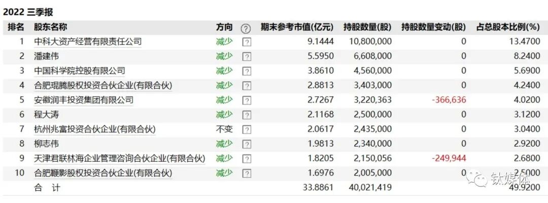 截至2022年三季度末,科大控股为第一大股东,持有公司13.47%的股份,潘建伟持有公司8.24%的股份。
