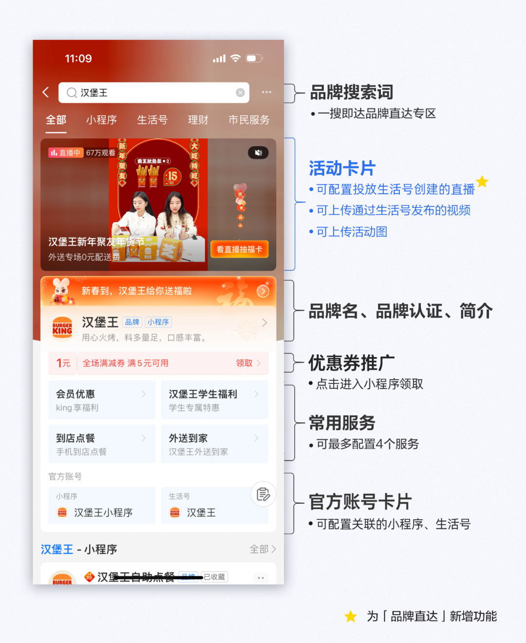 简单来说,只要用户在支付宝搜索栏中搜索品牌商家名称,就能立刻找到其直播间入口。