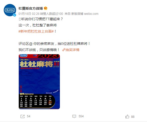 在微博,杜蕾斯还打造了#新年把杜杜放上台面#话题,主张用杜杜牌麻将,解锁秘密牌语。