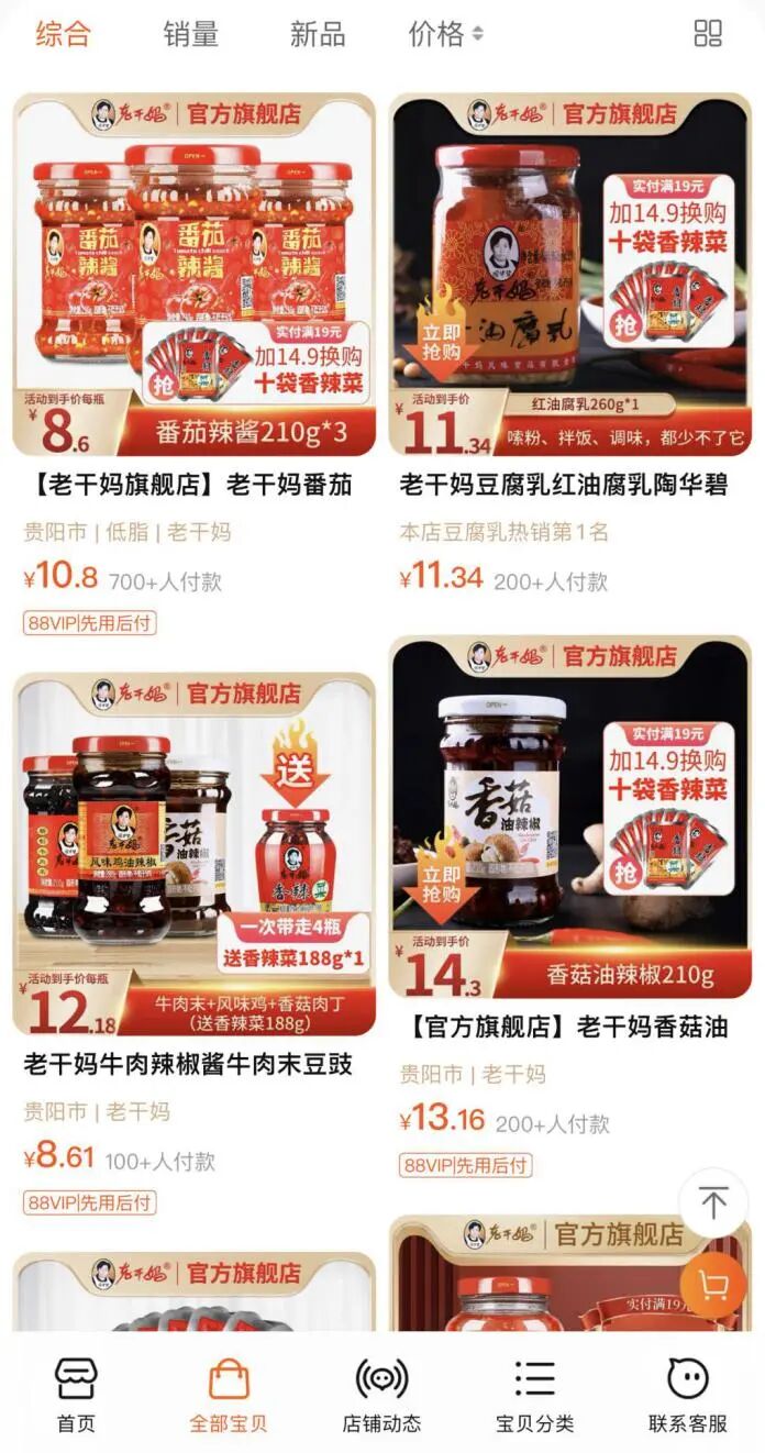 曾有人做过一组调查,结果显示有近半数消费者表示虽然喜欢老干妈,但同时也更愿意尝试新的品牌。很明显,面对不断涌现的新品牌,消费者们开始“动摇”了。根据天眼查显示,国内辣酱市场的年复合增长率近5%,而截止到现在一共有超过5000家企业入局,可以说是进入了红海竞争阶段。以前老干妈靠独特的风味走天下,但逐渐也因为口味单一变得没有以前香了,尤其最近几年新品牌们更是成长为老干妈最大的竞争对手。例如虎邦辣酱、饭爷、川娃子等品牌,借助网络营销的热潮率先抢占了一部分市场份额,而这些新品牌们所抢走的恰恰就是此前老干妈的忠实拥趸。事实也确实如此,现在我们再到京东或者天猫平台上搜索辣椒酱,首页出现最多的品牌是虎邦辣酱、川娃子、李子柒等,很难能够直接看到老干妈的身影。这些新兴品牌除了一直在从老干妈的口中抢食外,产品力上也相当吸引人。什么韩式风味、0脂轻食、大粒牛肉等,各种各样的卖点层出不穷,甚至有消费者直言,“与其说这些是辣酱,倒不如说可以直接当成菜来吃”。对比而言,老干妈作为传统辣酱,却始终只是一种调味料。同时除了口味上的差异,新品牌们也在渠道上另辟蹊径,避开和老干妈在线下的正面对抗。虎邦辣酱在2016年大力进军外卖市场,选择和70多家排名靠前的连锁品牌进行合作,一度创造出年复合增长率达300%的神话。李子柒、饭爷等品牌则选择走网红路线,通过名人IP进行带货,并且也都取得了不俗的销量。再加上各路资本的加持,新品牌们可谓来势汹汹,大有将老干妈合力“围剿”的趋势。![]()