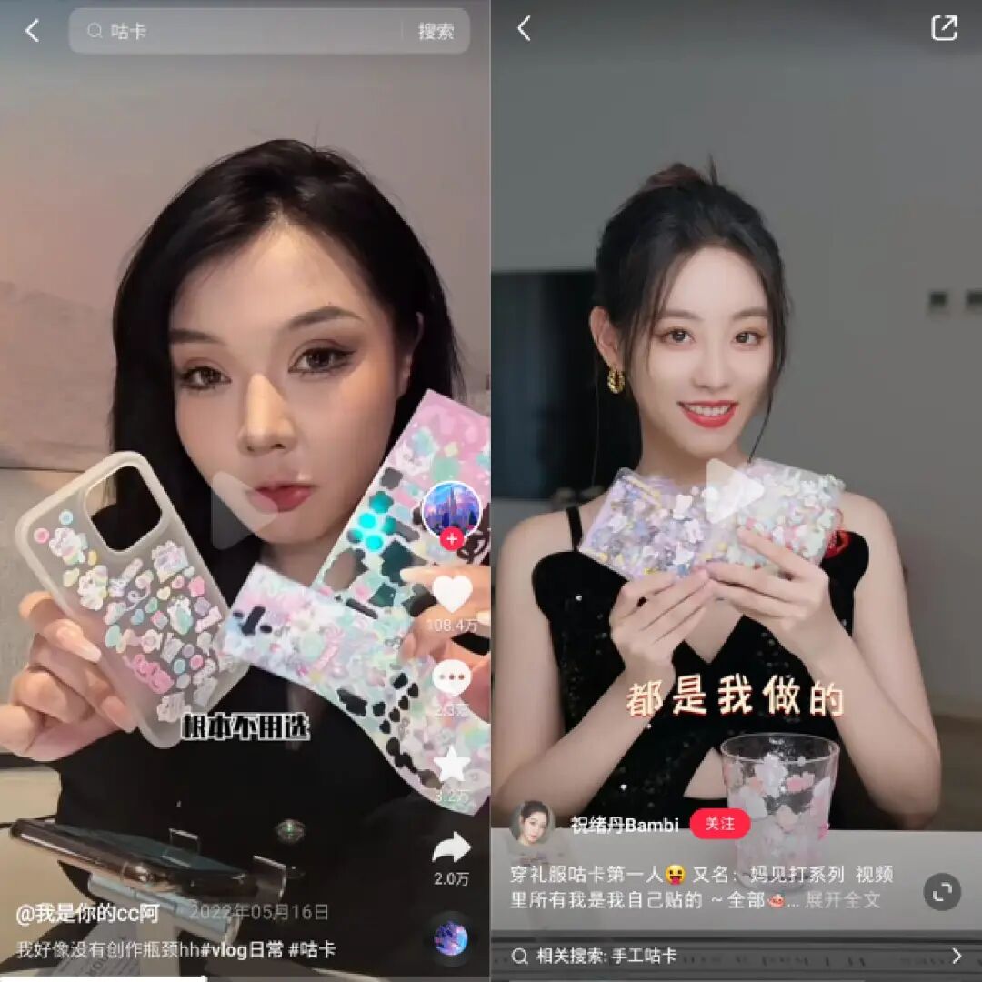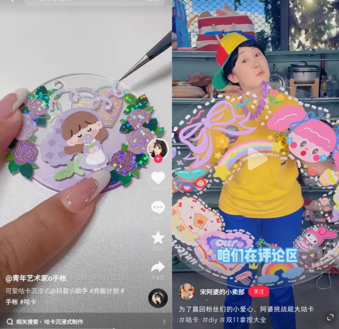图源抖音“青年艺术家o手账”,小红书“宋阿婆的小卖部”“咕卡”还成功引发了头部达人和明星的好奇心,纷纷进行“咕卡体验”。服装品牌主理人“我是你的cc阿”在抖音发布的咕卡视频获赞超百万,女演员祝绪丹在小红书晒出自己的“咕卡”作品,获赞超9万。图源抖音“我是你的cc阿”,小红书“祝绪丹Bambi”渐渐地,“咕卡”演变为万物皆可“咕”。卡砖、麻将、手机壳和耳机壳等和亚克力板有相似属性的东西,都成为被“咕”的工具,甚至连桌子和马桶盖也能成为超大号“咕卡盘”。![]()