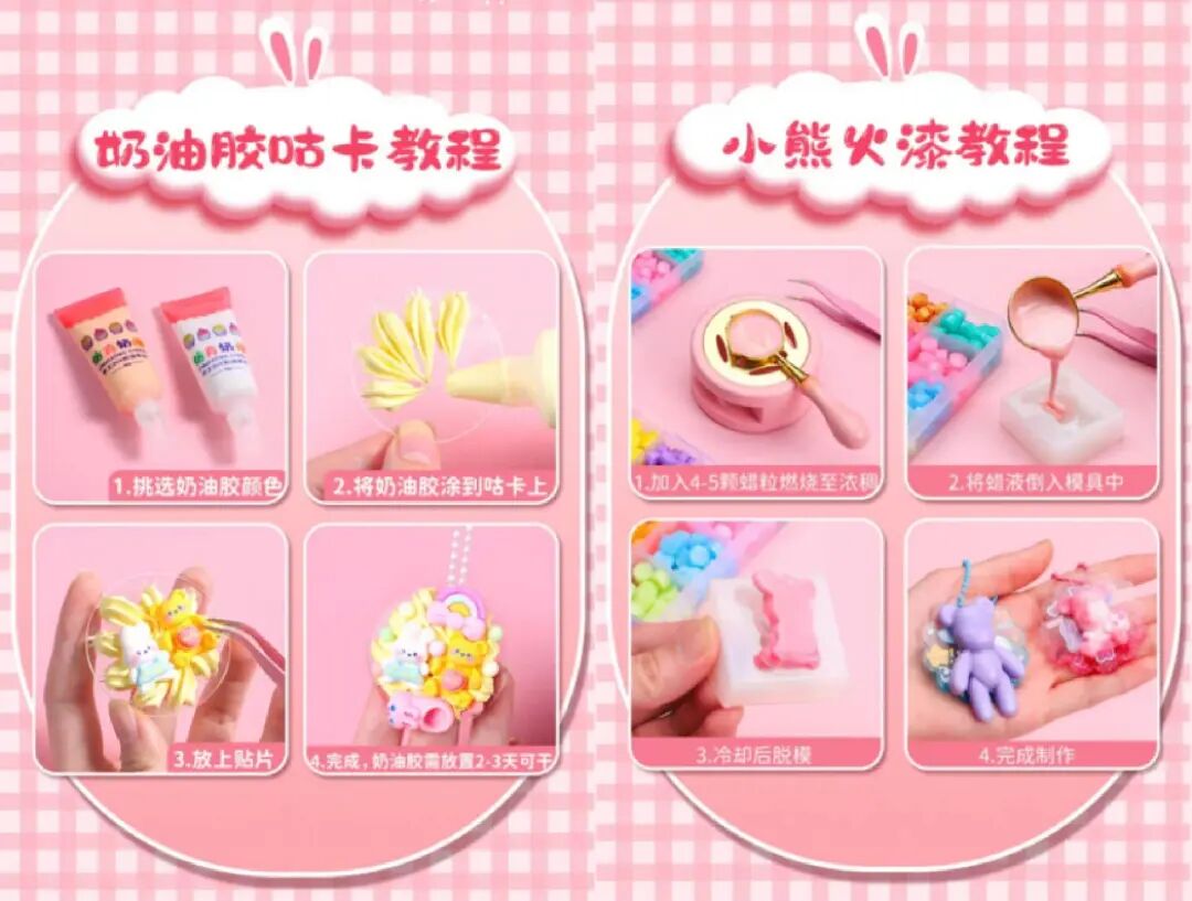 新抖数据显示,近30天内“咕卡”相关商品的预估销售额在百万元以上。据新榜编辑部观察,全套“咕卡”装备的价格集中在20~30元左右,卖家多为文具店。这个价格对于学生和家长来说往往易于接受,有一定可支配零花钱的小学生便能实现“咕卡”自由。今年五年级的格姐每月有150元的零花钱,“咕卡”的消费占据近一半的预算。“我每个月得精打细算,根据贴纸和咕卡盘剩余情况买,如果剩的不多了会花个六七块钱补新的。”“咕卡”爱好者们之外,家长是“咕卡”消费的主力军。在淘宝月销超5000的咕卡套装链接中,买家秀大多来自家长,不少网友晒出孩子们玩“咕卡”的图片视频,“孩子很喜欢”“没有女孩子能抵挡住咕卡”等评论屡见不鲜。格姐妈妈告诉新榜编辑部,“很多家长会把它当做孩子入门级的手工锻炼。家长是不希望小孩子一直玩手机的,做手工是一个很好的替代品,能提高孩子专注力又容易上手。我觉得幼儿园中班以上、操作力差不多的孩子就可以做‘咕卡’了。”随着线上走红,学习周围的线下文具店迎来“咕卡”的消费热潮。一家位于上海学区的文具店店主介绍道,目前寒假属于淡季,开学以后是旺季,进店的小学生,尤其是女生,几乎人手一盒咕卡套装,她们常常把做好的咕卡挂在书包上。在远离学校的文具店中,则看不到太多“咕卡”的身影。多家位于上海办公区及核心商圈的文具店,没有售卖咕卡相关的产品。“主要是小学生买得多,初中生就不怎么玩了。”某文具店店主说道。为了应对小学生们的三分钟热度,“咕卡”产品不得不创新出更多玩法,常见的升级款产品有“咕卡”和奶油胶、火漆印章的结合。奶油胶咕卡是使用奶油胶将立体的贴片“咕”到卡盘上,火漆印章的玩法则更为复杂,需要用火把蜡粒融化,倒入模具中冷却定型,再粘到卡盘上。格姐近期便痴迷于火漆印章咕卡,在她看来,“咕卡应该能流行挺久的,因为它有很多种形式,一开始我也没想到火漆印章也可以咕,主要是享受做手工的过程”。