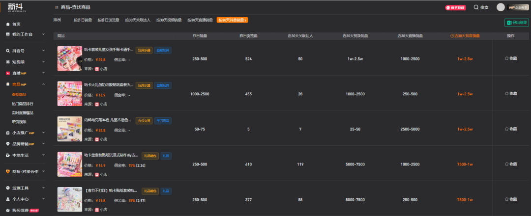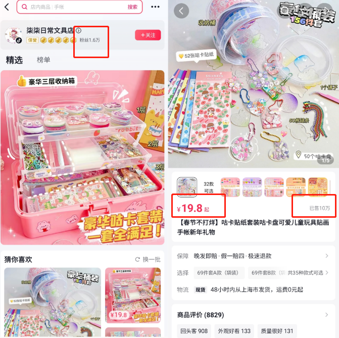 “我最开始是刷到‘咕卡’的视频,就让妈妈给我也买了。”格姐说。她去年在抖音被种草后入坑,随后自己做的“咕卡”教程视频发布后,引来大量网友求链接。格姐的妈妈透露,最开始是给网友们发淘宝的链接,后来才发现,其实可以直接在视频里挂小黄车。不同于格姐妈妈的后知后觉,一些商家早早发现了商机,仅靠“咕卡套装”便实现了销售额破百万。这些账号粉丝往往不高,靠精美的“咕卡”视频进行引流,万粉上下的文具垂类小号展现出惊人的带货爆发力。比如抖音粉丝量仅1.6万的“柒柒日常文具店”,一款19.8元起的咕卡套装卖出10万份,预估销售额超200万元。