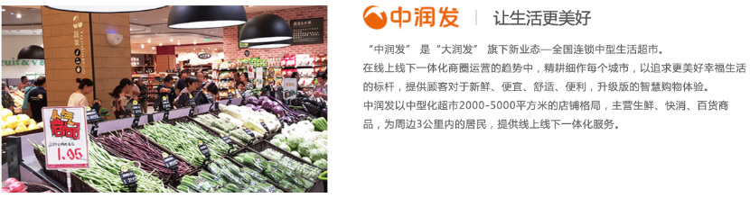据官方介绍,“中润发”是大润发旗下的中型生活超市,店铺格局在2000-5000平方米,主营生鲜、快消、百货商品,定位为“让生活更美好”。