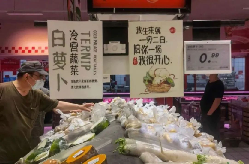 就在去年6月份,上海全面解封后,大润发结合蔬菜所设计的文案物料成功破圈,登上微博热搜第一。