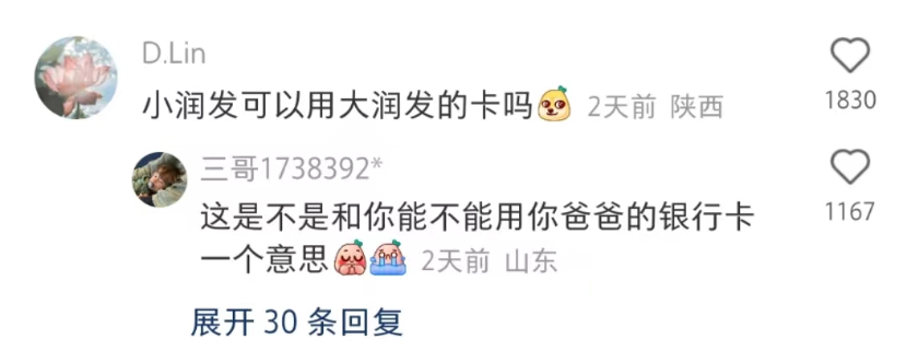 网友的回复令人笑喷,“这是不是和你能不能用你爸爸的银行卡一个意思”?