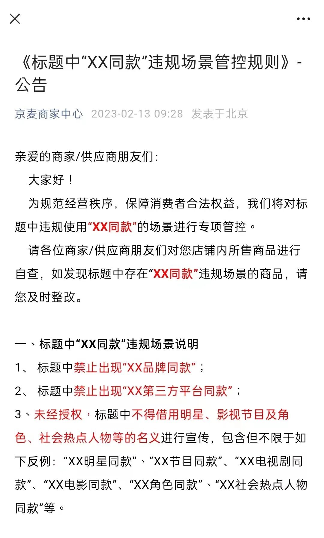 近日,京麦商家中心发布了一则《标题中“XX同款”违规场景管控规则》公告。京东表示,为了规范经营秩序,保证消费者合法权益,其将对标题中违规使用“XX同款”的场景进行专项管控。