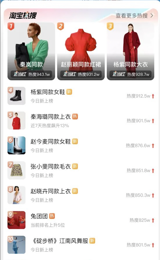 1月21日除夕当晚,“秦岚同款”“赵丽颖同款红裙”“杨紫同款大衣”等搜索词条,直接霸榜淘宝热搜。