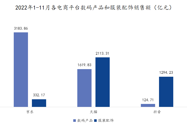 久谦中台数据显示,去年前11个月,京东数码产品销售额3184亿元,接近天猫的两倍;服装配饰销售额却只有332亿元,不足天猫的五分之一。