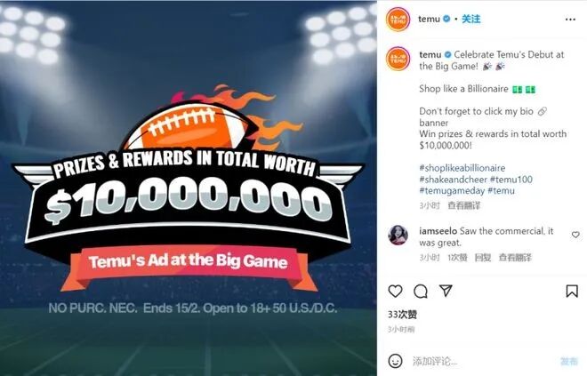 尽管主要受众都在北美市场,但作为“美国春晚”,一年一度的超级碗始终是全球最具有商业价值的超级赛事。这次与拼多多Temu一起出现在超级碗上的还有谷歌、乐天、优步、百事可乐。刚刚诞生5个月的Temu也成为有史以来在超级碗投放广告的最年轻的品牌之一。有意思的是,这条广告片延续了拼多多打广告的一贯传统:简单却洗脑。就像在国内拼多多留下了“拼多多~拼多多~拼的多~省的多”的洗脑旋律和广告语一样,这则美国春晚上的广告,也给用户留下了“像亿万富翁一样购物”(Shop like a billionaire)的品牌口号。而除了这两条洗脑广告之外,拼多多还将国内常见的“摇一摇送红包”玩法整合进了营销活动中,Temu将通过"欢乐摇一摇"扫码互动活动送出价值1000万美元的奖励和优惠券。与此同时,在超级碗赛后,拼多多给Temu的这则广告还购买了两个广告位,之后会在下周一举行的赛事中继续出现。简单估算一下,两个广告位和1000万美元的摇一摇优惠券,这一场营销大战,拼多多的总耗费远不止一千万多万美元。如此一掷千金的举动,瞬间刷爆跨境电商圈,一时间“谁是Temu,它怎么这么有钱?”“他们的东西那么便宜,是怎么买得起几个超级碗广告的?”等关于拼多多海外版的问题,引起了海外用户的大讨论。值得注意的是,在拼多多通过美国春晚收获流量,扩张声量之际,多家媒体报道显示,拼多多正在入局北美的另一个重要市场:加拿大。目前Temu已允许美国以外的手机号码进行注册,部分跨境电商商家也反馈收到了拼多多即将开通加拿大站点的通知。今年1月末,拼多多的运营人员已通知部分商家准备加拿大站点的规划。预计最快将在今年第一季正式上线Temu加拿大站。事后诸葛亮的来分析一下,此次拼多多登上美国春晚打广告,看似没有预警,其实背后确实必然。在今年的央视春晚之前,市场纷纷猜测拼多多或将是最大的红包赞助商,接棒2022年京东的15亿红包,走上春晚舞台。或许在那个时候,将业务中心放在海外扩张上的拼多多,就已经想好了营销预算的新渠道,此次拿下"美国春晚",其实是黄峥在进一步释放自己的出海野心。一切就像2016年的央视《对话》节目中展现的那样,面对张一鸣,黄峥说道:“如果我是张一鸣,会更加激进地推进全球化。”现在拼多多在北美地区的狂飙突进,正在印证黄峥当年提出的设想。