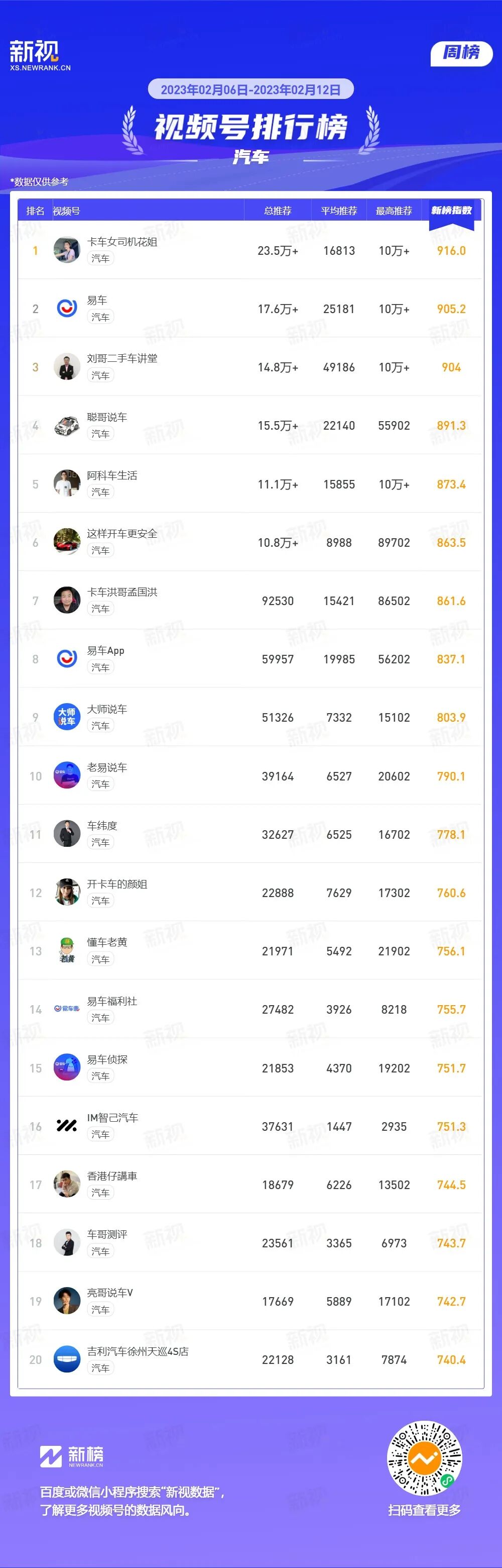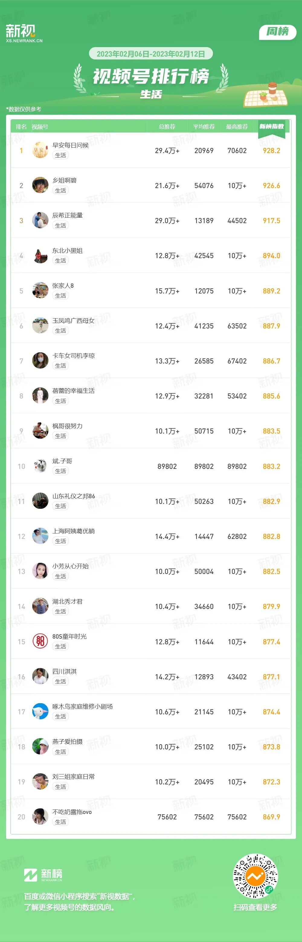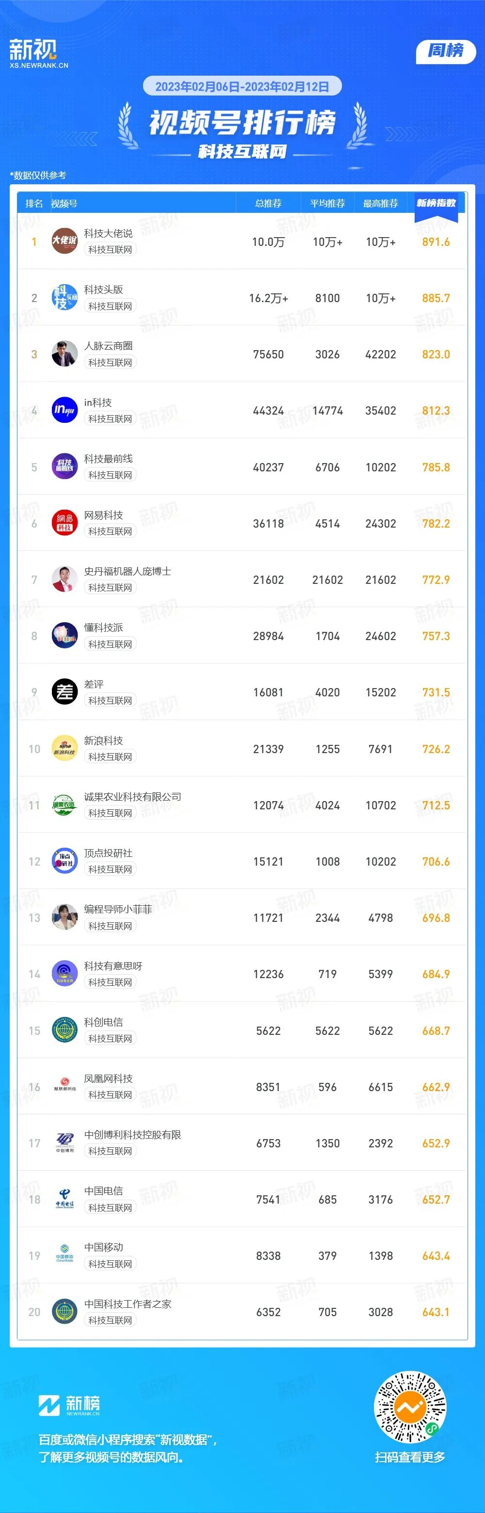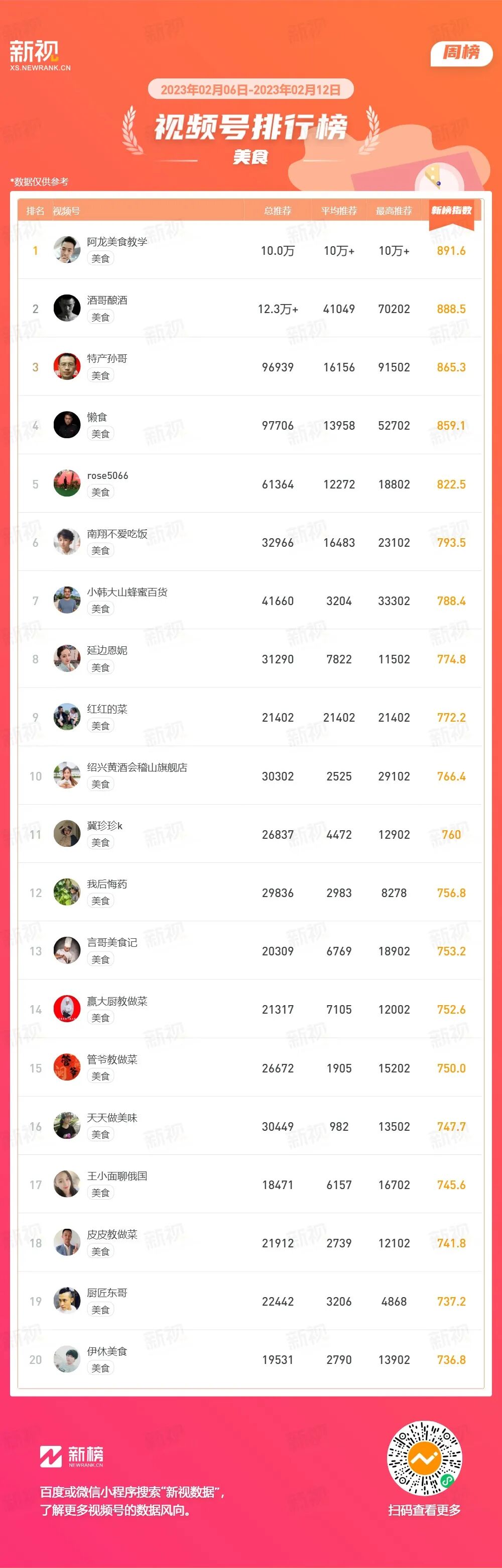 新榜通过旗下视频号数据平台“新视”发布微信视频号周榜(2023年2月6日到2023年2月12日)。