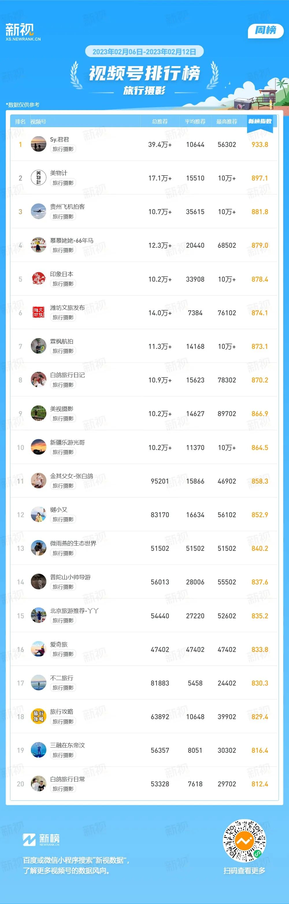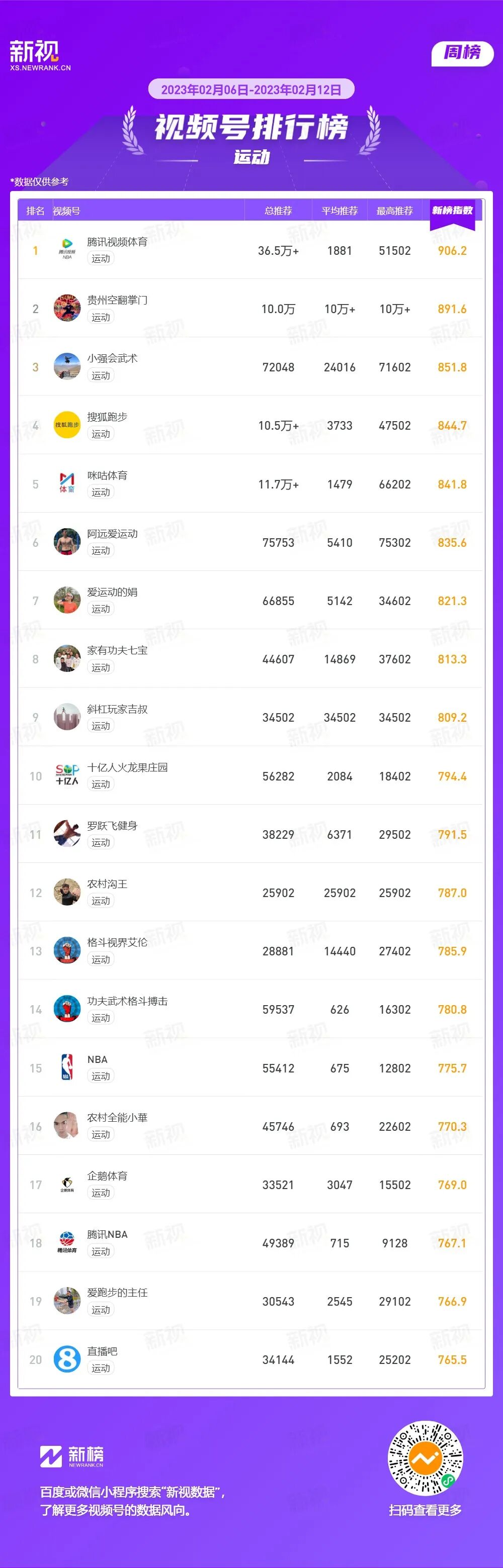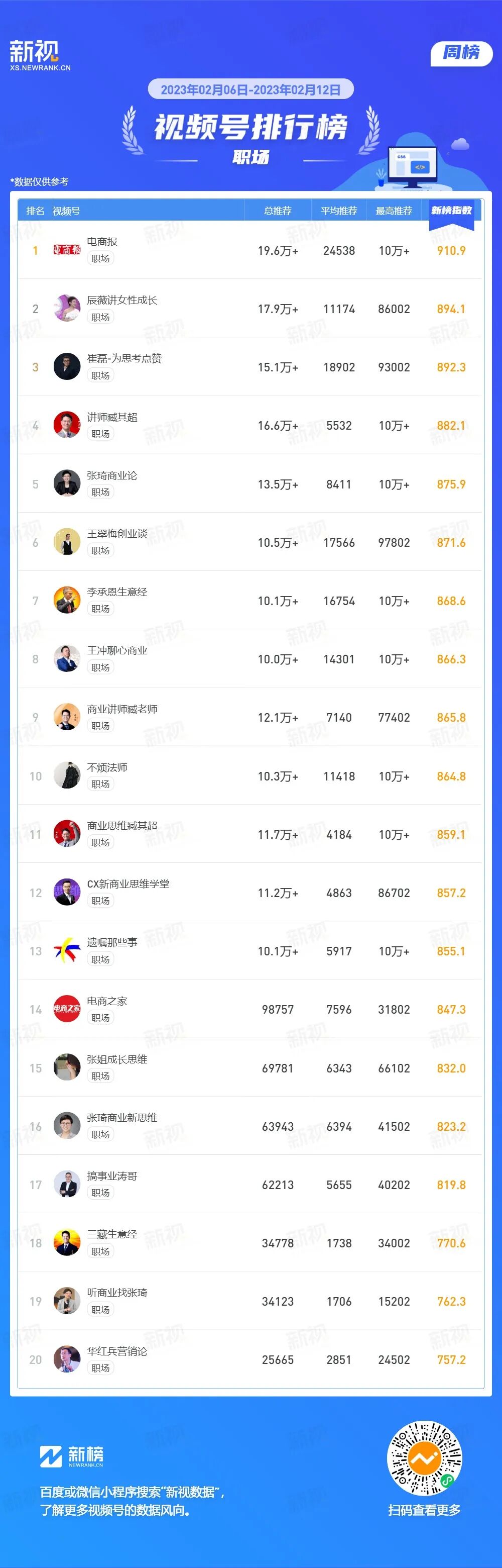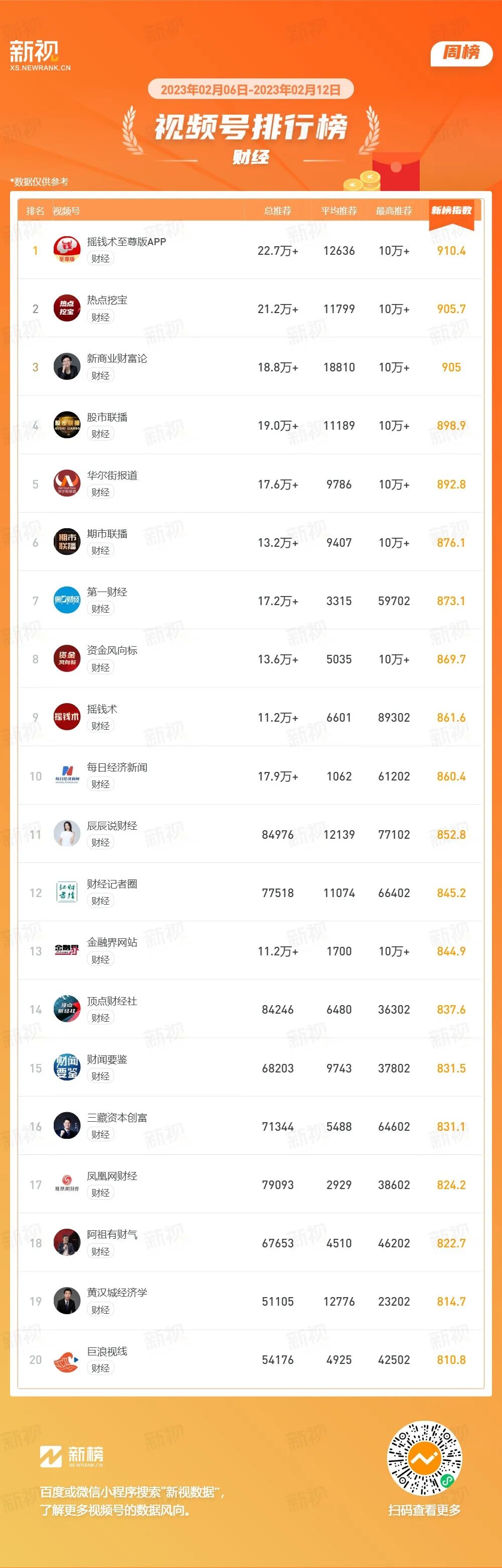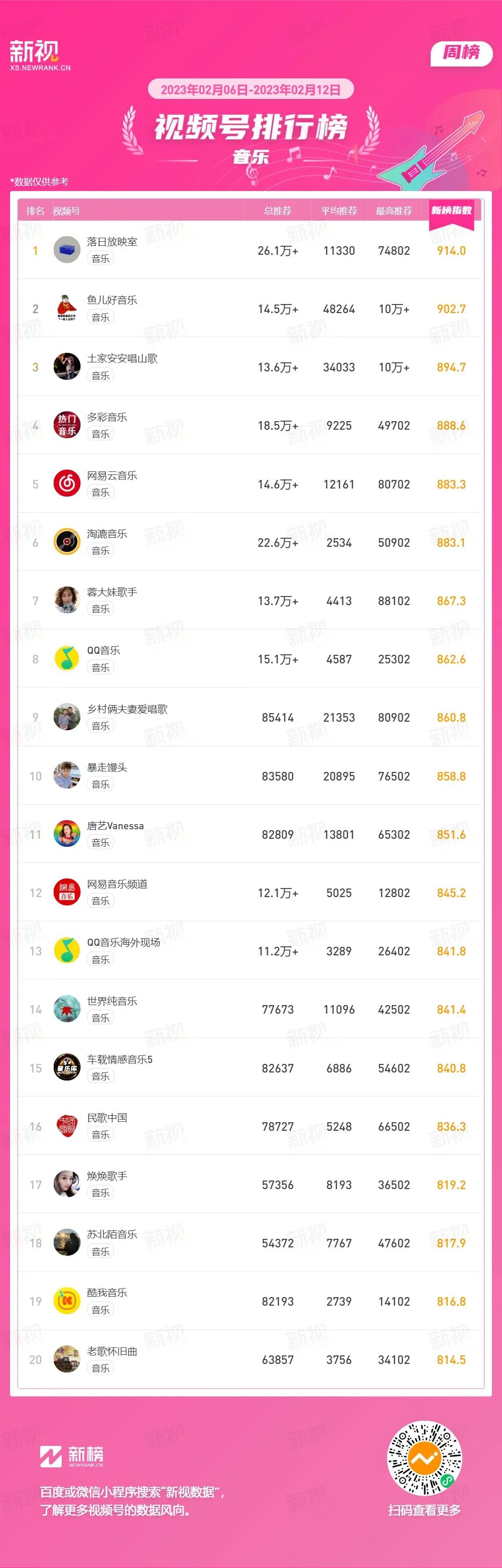 新榜通过旗下视频号数据平台“新视”发布微信视频号周榜(2023年2月6日到2023年2月12日)。