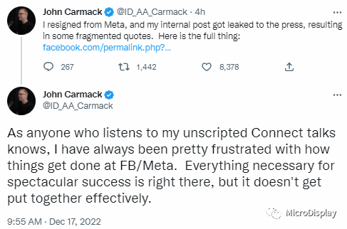 Meta的VR执行顾问约翰·卡马克宣布辞职。他是id Software的创始人之一,曾担任《毁灭战士》《德军总部3D》等游戏的主程序。后来在Oculus担任首席技术官期间因被收购而加入Meta。