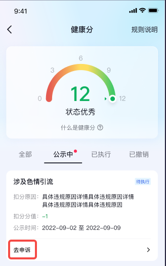 【查看商家健康状况和违规详情】点击【健康分入口】跳转至详情页,即可查看目前分值情况、违规明细及违规原因【违规申诉】健康分详情页下方点击公示中,即可查看违规明细,点击去申诉,即可一键跳转申诉界面填写申诉理由和上传申诉材料